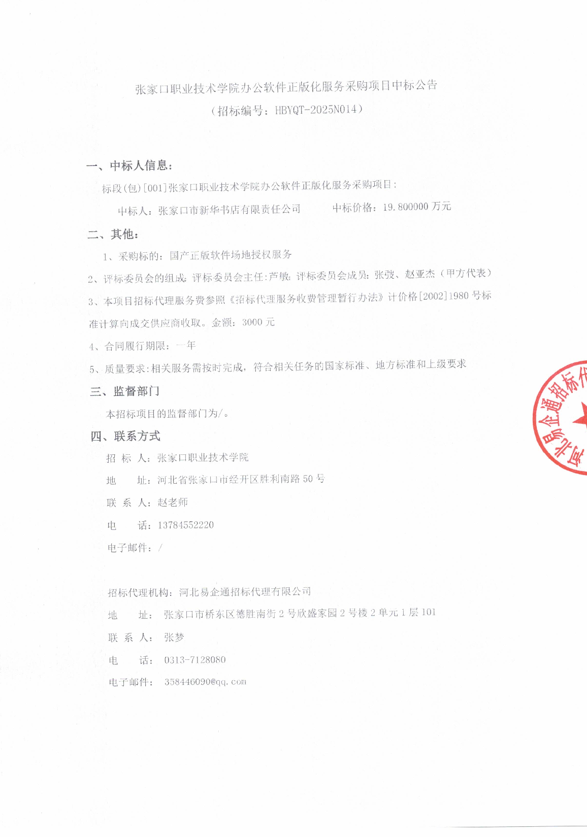 張家口職業(yè)技術(shù)學(xué)院辦公軟件正版化服務(wù)采購項目中標(biāo)公告