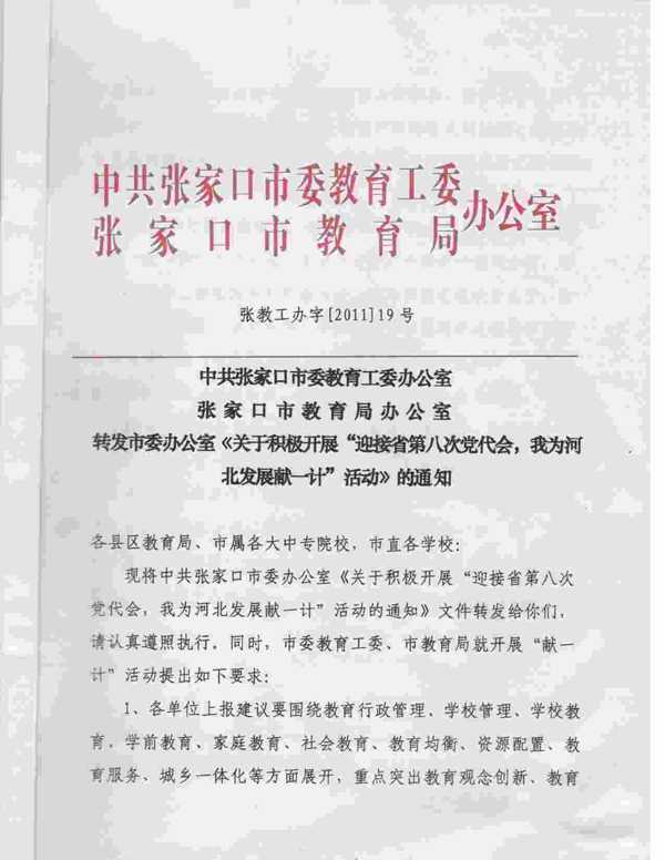 附:中共張家口市委教育工委辦公室張家口市教育局辦公室轉發市委辦公室《關于積極開展“迎接省第八次黨代會,我為河北發展獻一計”活動》的通知