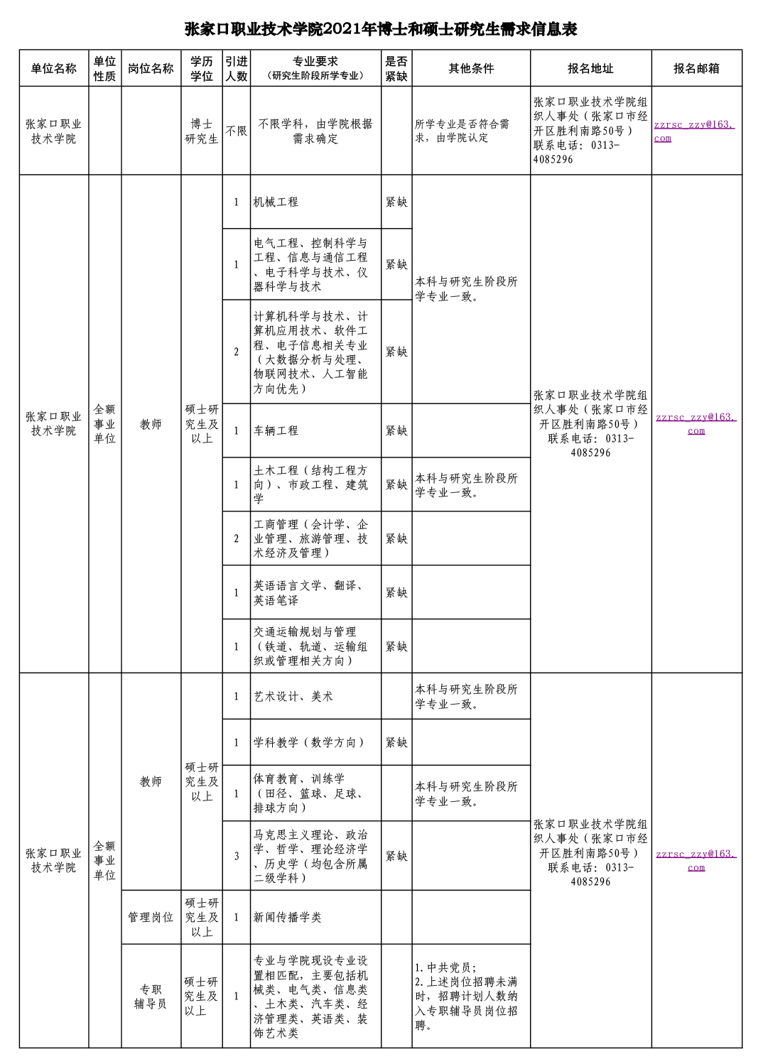 2.所學專業必須與用人單位需求專業對口,同時具備各專業要求的其他條件,詳見《張家口市2021年博士和碩士研究生需求信息表》;