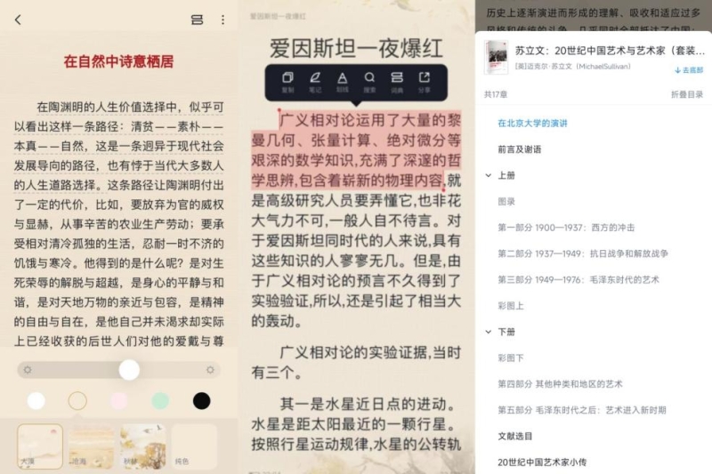 元閱讀采用熱門的epub流式排版,設(shè)計(jì)精致,允許用戶根據(jù)個人偏好及閱讀環(huán)境調(diào)整背景色彩與屏幕亮度。在閱讀時,利用目錄快速跳轉(zhuǎn),輕松定位,同時支持即時記錄閱讀心得。