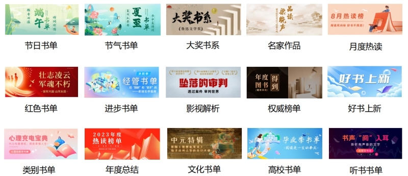 節(jié)氣書單、好書上新、大獎書系、熱讀榜、節(jié)日書單等特色主題書單,每月定期更新,旨在讓書籍煥發(fā)光彩,為讀者帶來新的發(fā)現(xiàn)。