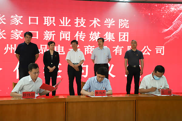 在隨后進(jìn)行的校企合作簽約儀式上,常務(wù)副院長李煒杰、張家口新聞傳媒集團副總經(jīng)理王哿、北京神州優(yōu)品電子商務(wù)有限公司負(fù)責(zé)人顧偉朋代表三方進(jìn)行簽約。