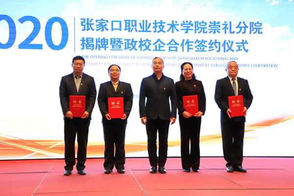學院黨委副書記、院長王立軍為崇禮區副區長、崇禮分院院長馮莉群,學院經濟管理系黨總支書記、主任、崇禮分院副院長崔健,學院應用外語系黨總支書記、主任、崇禮分院副院長張曉鵬,崇禮區職教中心校長、崇禮分院副院長馬偉龍頒發聘書;為富龍控股有限公司授張家口職業技術學院實習實訓基地牌匾。