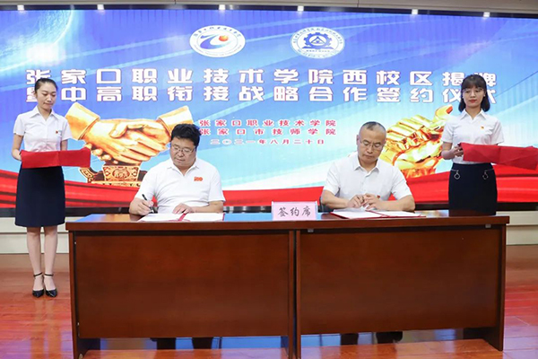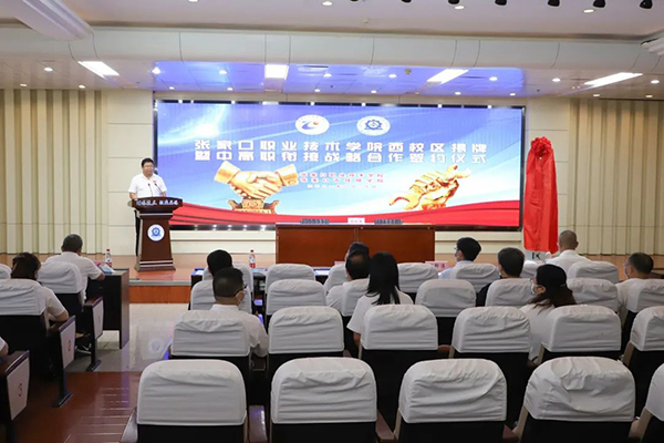 黨委書(shū)記馮印濤與張家口市技師學(xué)院(張家口機(jī)械工業(yè)學(xué)校)黨委書(shū)記張樹(shù)敏為張家口職業(yè)技術(shù)學(xué)院西校區(qū)揭牌。